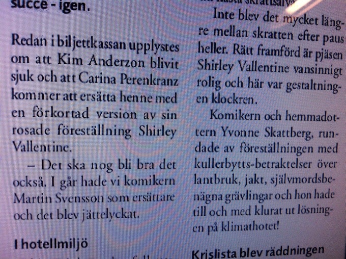 Perenkranz mer än godkänd som ersättare 6 mar 2013 av carinapernilla Svenljunga , Tranemo och Ulricehamns tidning skriver att Carinas inhopp var succé . Rubriken från Panik till succé . Skönt, gött och smickrande! Carina Perenkranz