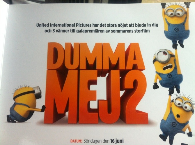 Nu kommer Dummamej2. Jag och mina barn laddar inför Galapremiären i eftermiddag! Vi tyckte mycket om ”ettan”, som jag tycker har lite budskap, vilket alltid är bra även om det är barnfilm. Nu är jag och mitt yngre sällskap ”aspepp” och ser fram emot efterfest m Minionerna på Birka Cruises 🙂