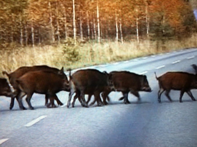 På väg hem från Hallstahammar såg vi helt plötsligt hur ett helt gäng grisar korsar vägen ngra hundra meter framför oss. I en prydlig rad täcker de hela vägbanan och jag inser att hinner vi inte bromsa nu så kör vi på ngt av djuren.