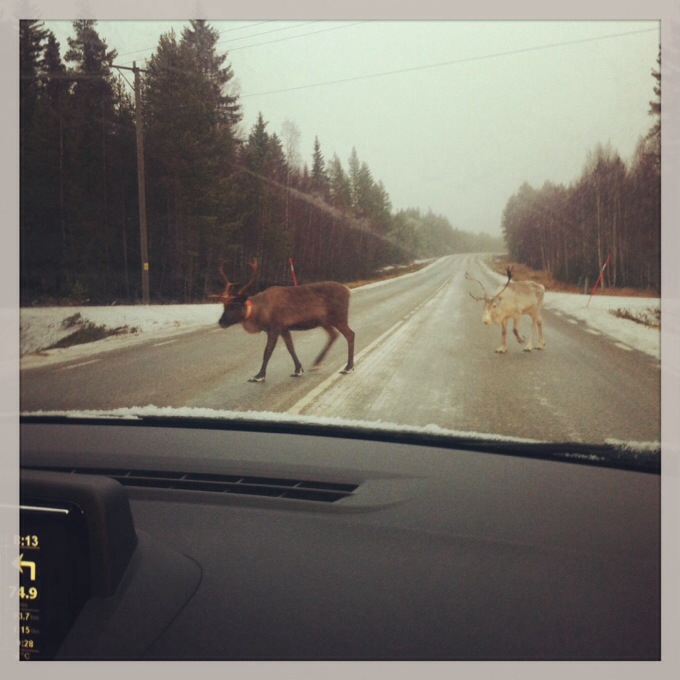 Rudolf o hans polare är ju bra gulliga, men det kan vara så lagom mysigt att träffa på dom mitt i vägen i morgongryningen. Vi konstaterade att ”det måste ju vara sjuuukt mycket vilt olycker här uppe”! Men folk i Norr är kanske vana att det strövar renar överallt;) Vad vet jag ? 😉
