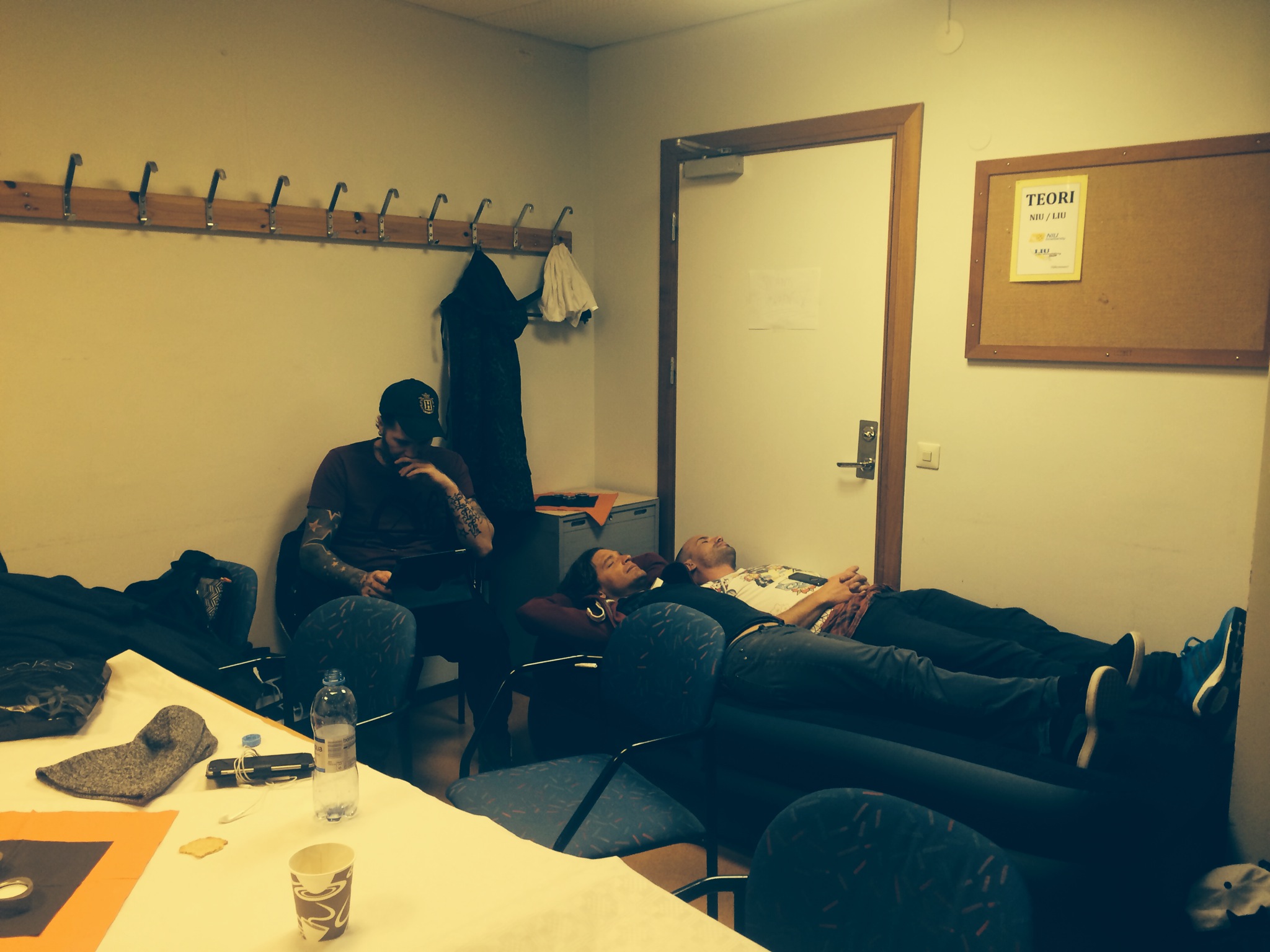 Mellan varven vilas det. Martin Stenmark har fixat en egen liggkomfort. Här delar han den kamratligt med Andreas Johnsson medan Brolle arbetar frenetiskt.