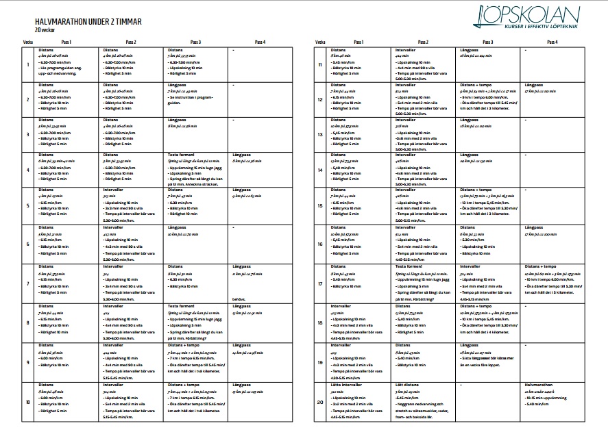 Detta schema är alltså 20v och skall ge mig riktlinjer för att ta mig i mål på 2h. Till övningarna/förberedelser ingår både löpskolning, bålträning och vanlig löpning. Löpskolning och bålträning är något jag kommer köra hårt med för att få ut maximalt av min löpning. Det må vara ovant men det kommer definitivt inte skada!