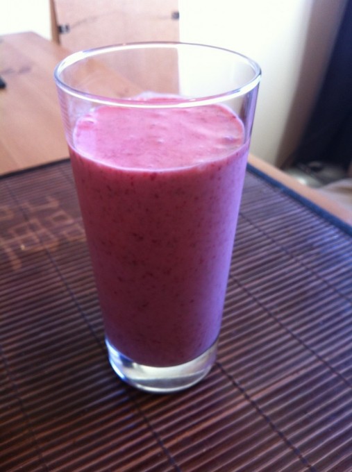 När jag kom in gjorde jag mig min favoritsmoothie – banan/jordgubb/vanilj. Vägde allt idag och det visade sig att den innehöll 200 kalorier, ett helt lagom mellanmål i min värld. God är den också 🙂