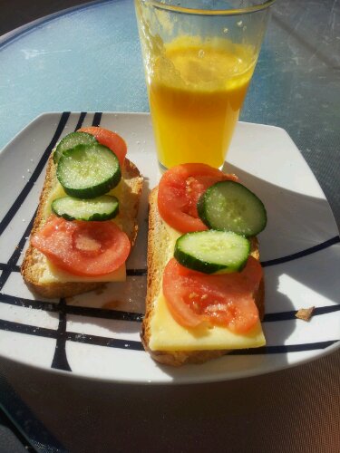 jag gjorde just frukost och det blev färskpressad apelsinsaft och rostade mackor så gott.