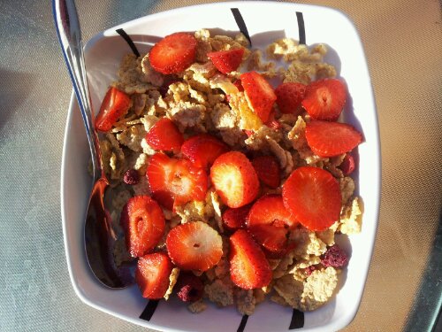 frukost 7 februari 2013 av kristallgrottan Sitter just nu i solen och äter frukost på altanen, känner mig lite duktig äter flingor med färska jordgubbar mm så himla gott 🙂