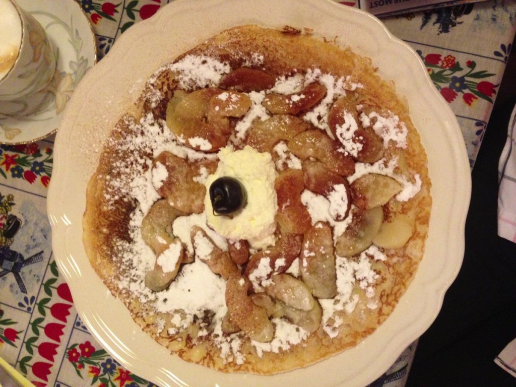Nej, det är inte en pizza, det är en jättelik pannkaka. Överallt i Amsterdam vimlar det av små pannkakshus där det serveras dessa sagolikt goda rätter. Den här pannkakan avnjöt jag på Upstairs (Grimburgwal 2), ett minimalt ställe dit du bara kommer genom att klättra (!) upp för en jättebrant trappa.