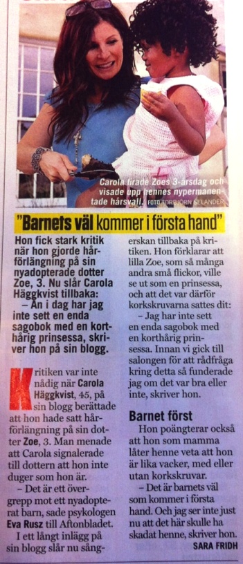 Jag ska börja med att gratulera 3åriga Zoe, för att hon förhoppningsvis nu har fått en trygg familj som älskar henne och ger henne trygghet. Allt för många barn runt om i världen kommer aldrig att uppleva det. Mamma Carola har säkert vägt in medias evighetsintresse i den nya familjemedlemmen. Hoppas att hon lär sin dotter hur man ska hantera både vänliga, men också skräckinjagande reportrar som vill ha minsta kaksmula privatliv.