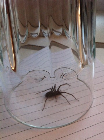 Den spindel jag mötte igår var om möjligt det största jag har skådat i hela mitt liv. Med en dammvippa i äkta strutsfjädrar i handen, var min enkla plan, att gå från ett rum till ett annat. Det var allt jag begärde. Så fort jag förstod vad jag höll på att rusa in i, tappade jag vippan, backade omtumlat bakåt och krampade ihop i ett ångestskri. Att i den skräcken, försöka kväva rysningar, kväljningar och läten, blir extremt komiskt för den som ser reaktionen. Vilket min dotter gjorde. Det gick inte att vara hjältemamman just då, hjärnan la av och skickade nödsignaler åt alla håll. Jag såg nog ut som Farbror Frej med svår tourettes. Och överallt kliade det på mig. I mitt sinne fanns krypet i mitt hår, under min tröja och på fötterna. Dessutom hade den multiplicerats till att bli tusentals exemplar i min fantasi.