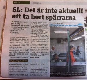 Dagens Metro, skriver om det ökande motståndet mot klämspärrarna. I nuläget tänker SL inte göra någonting åt det, som det verkar. Och så länge de vägrar, så fylls passagerarnas skadekvot på, för varje minut som går. Jag är själv alltid lite misstänksam och placerar väskan framför mig, innan jag går igenom tunnelbanespärrarna. Bättre en klämd handväska, än en smäll mitt i nyllet. När samma system fanns på TV4, hörde jag svordomar och förskräckta utrop dagligen. Någons pappersmugg med kaffe, höggs av utan förvarning, någon annan gång smällde spärrarna ihop trots att man inte hunnit passera med hela kroppen igenom. Varje gång jag gick in och ut, var det som att utsätta sig för italienska ”sanningens mun” som biter handen av den som ljuger. Jag blundade, drog kortet och hoppades på det bästa. Yes, jag klarade mig den här gången också…