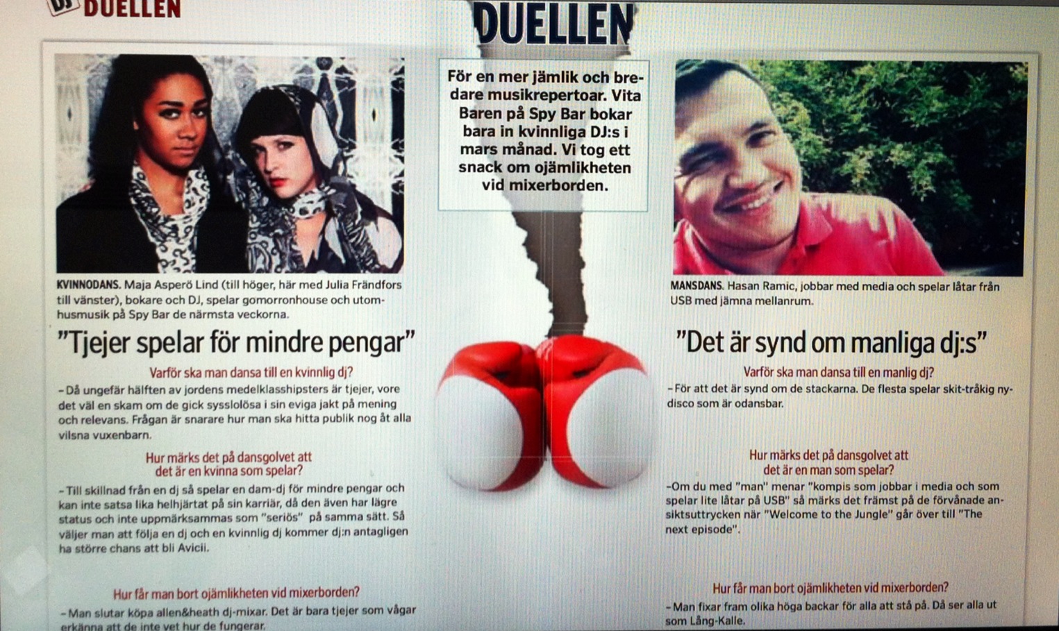 Jag spelar inte längre, men jobbade som DJ under drygt 10 års tid. Att ta sig fram som kvinna i en mansdominerad värld, är kämpigt. Oavsett om det gäller bolagsstyrelser eller DJbås. Det gäller som vanligt att bevisa lite extra vad du går för. Just därför satsade jag på att bli vass rent tekniskt, för att kunna sätta dumstrut på den eller de som undrade ”när DJn skulle komma.” Två av tre frågor i artikeln är direkt felställda och poängterar eventuella skillnader, snarare än att utplåna rostiga uppfattningar.