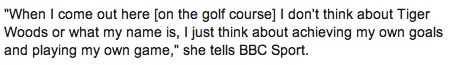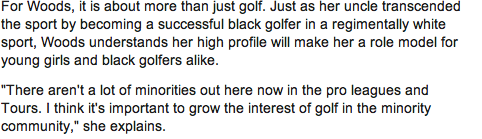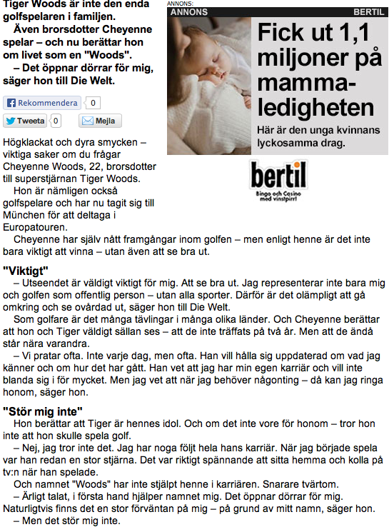 Vad är det för nöt till reporter som har snickrat ihop detta sammandrag från den tyska artikeln i Die Welt? Pontus Weinemo har valt att ta ut de mest ointressanta raderna, för att presentera golfproffset Chayenne Woods. En enda mening tillägnas hennes karriär. ”Hon har nått framgångar” är det enda som nuddar ämnet. Att hon har vunnit 30 amatörtävlingar, innan hon blev proffs förra året, är tydligen inte intressant. Att hon vill skapa sig ett eget namn och komma ur skuggan av sin släkting Tiger, är inte heller relevant. Att hon har högklackat för att hon gillar att se längre ut med sina 1,69cm skulle kunna minska intrycket av att detta är en kvinna som i sinnebilden nästan skulle kunna stå i diamanter och högklackat på greenen. Hennes engagemang för att vara ett föredöme för unga, svarta tjejer vill reportern inte skriva om eller googla på. Han tar de minst intressanta raderna ur orginalartikeln och gör det till rubrik. På BBC Sport hittar jag en betydligt mer intressant text med citat som dessa:
