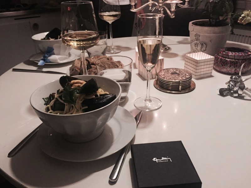 Sedan fick jag snällt sitta och dricka champagne medans min egen kock lagade musslor till mig. Varför gå ut och käka när han är så duktig? Och åh, just det..han skojade om palmen, den fick jag från hans familj. Istället fick jag en Efva Attling ask med ett vackert halsband i. Amor vincit omnia står det. Jag älskar min H så mycket, sån trygghet och kärlek jag får från den mannen är grädden på mitt härliga liv.