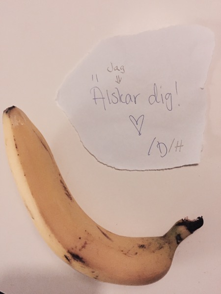 Kom hem nu och lappen var minsann besvarad! Tillsammans med en banan då jag försöker undvika godis hahaha. Mums. Mannen i mitt liv är han<3