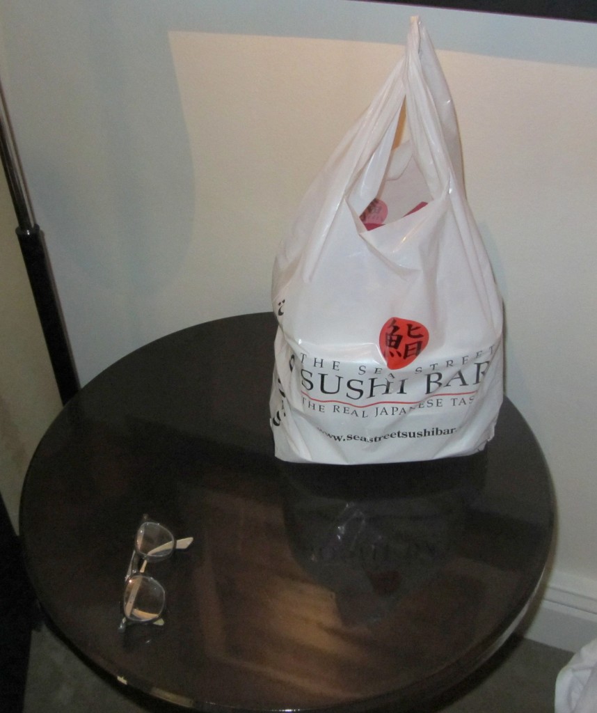 Här sitter man, i hotellsviten och njuter av 17 bitar sushi.