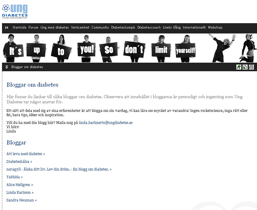 Att inte min adress får vara med på ungdiabetes.se är mycket märkligt!? Jag kan inte förstå det, och ja, jag har mailat och bett om att få vara med bland ”bloggar” . Tror även att jag har mailat minst två ggr, men utan att ha fått ett svar.