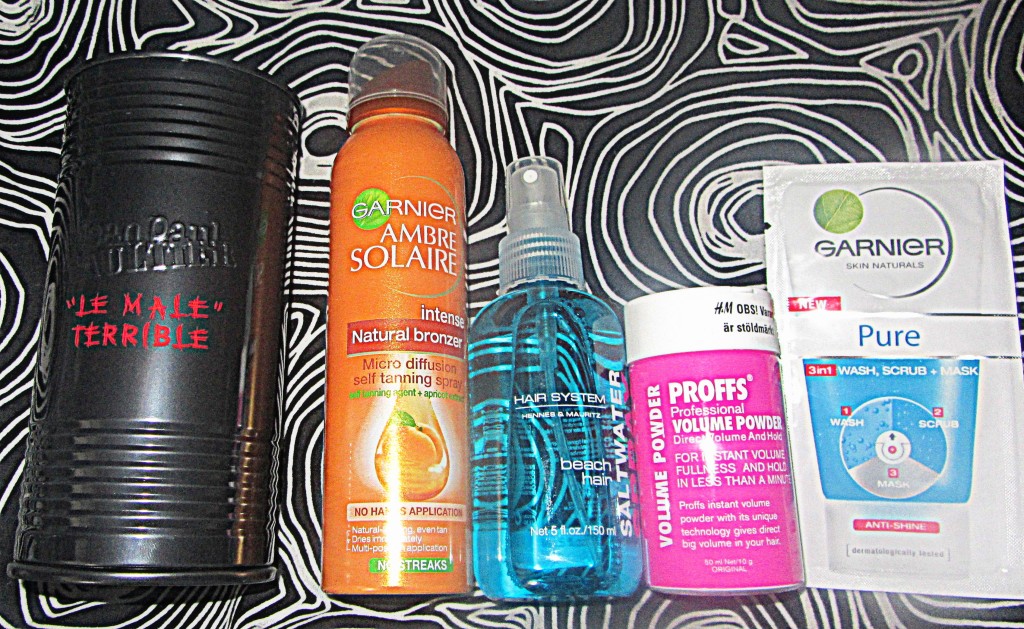 Jean Paul nya parfym, brun utan sol ( Grym. Utomlandsbränna), salt water ( Hjälper dig att få en ruffsig frisyr.), Powder ( Galen volym), Garnier ( För ansiktet.)