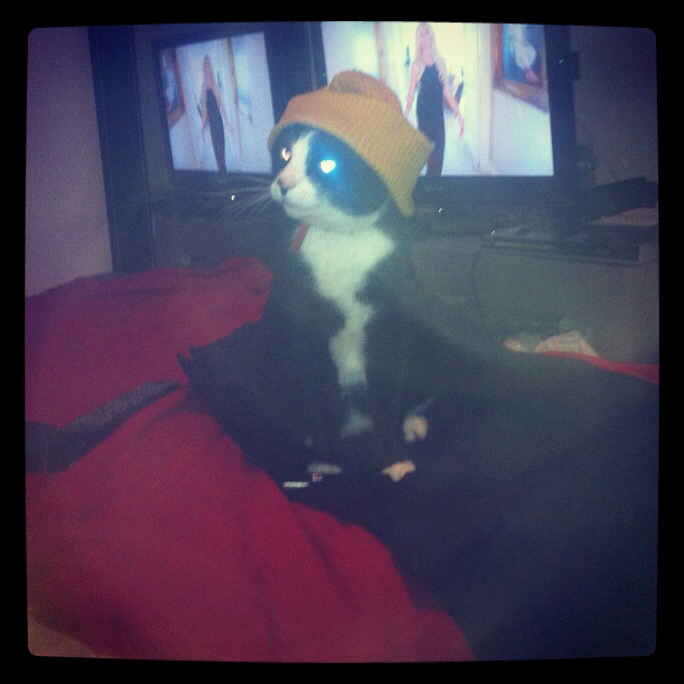 I morse vaknade jag upp med att se my cat Torkel ha på sig min rullade mössa. Helt sinnes. Vilken syn!