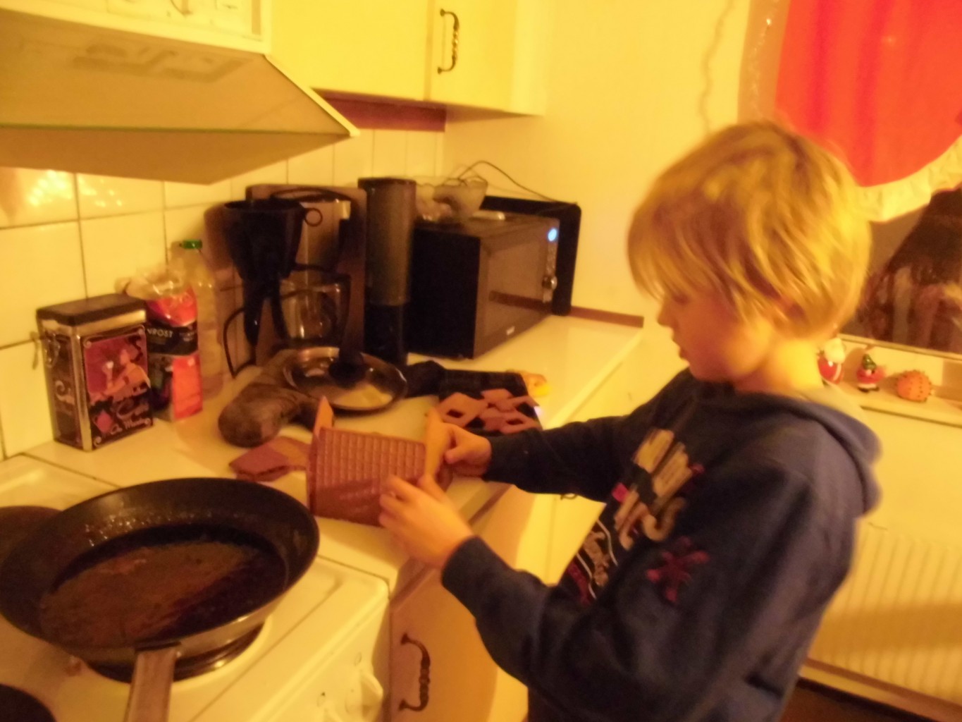 Idag: Har jag gjort hemmagjord pyttipanna som min stora son tyckte mycket om. Fick gratis potatis av grannen som jag stekte med julskinka och gullök. 🙂
