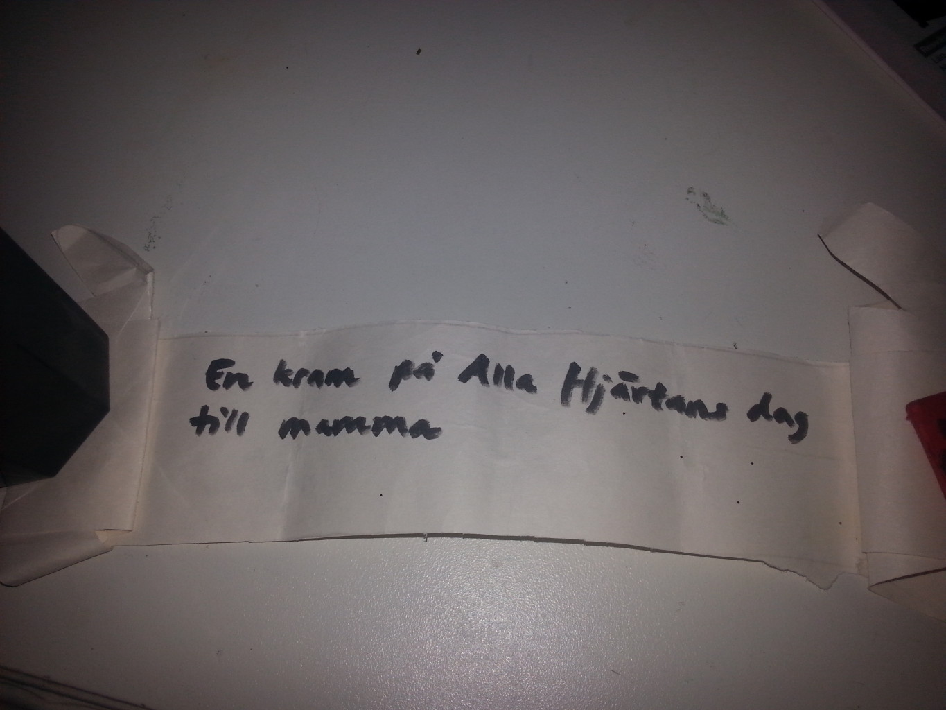 Så söt min lilla är 🙂 hittade denna i väskan och han la papperlappen runt om mig och sen sa min lilla son -En kram till dig mamma. 🙂
