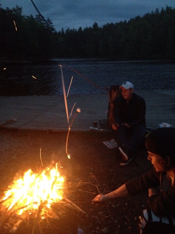 Sitter vid sjön med en brasa och underbart sällskap, så det ska vara!