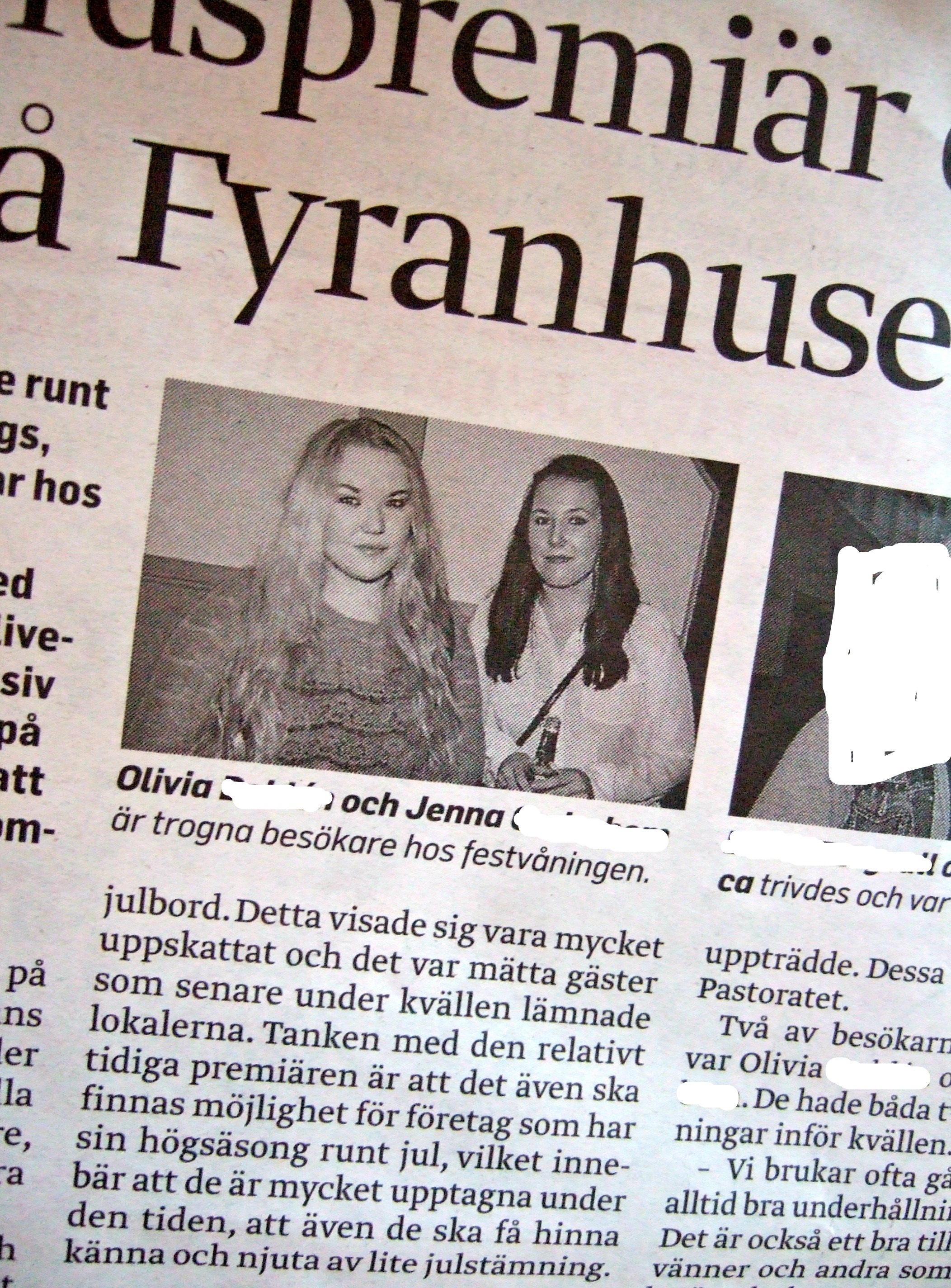 Intervju i tidningen 26 nov 2012 av Ƹ̵̡Ӝ̵̨̄Ʒ - [Doitwithstyle] - skaparglädje, inspiration, foto, pyssel, m.m I lördags när jag och Vivvi var ute så vart vi intervjuade av en reporter (heter det så?). Hon ställde några frågor och tog en bild av oss. Det var kul att få se det imorse faktiskt. Jag och min böna var ju ett riktigt fint par för kvällen, haha!