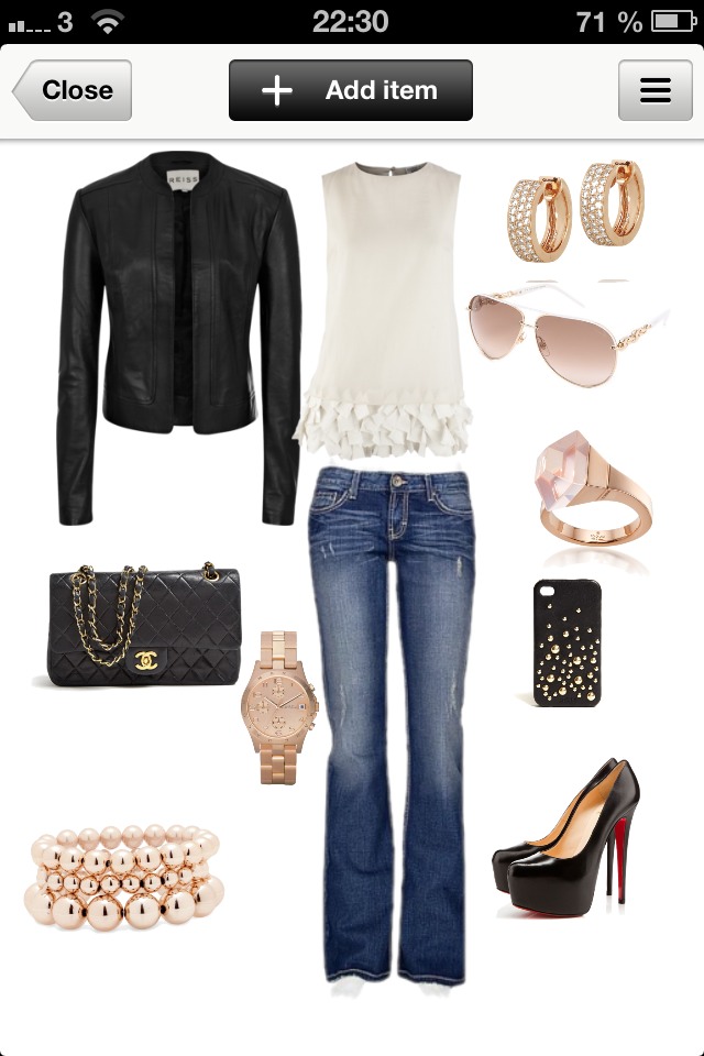 Skinnjacka, jeans och ljuvlig topp. Accessoarer av roseguld; klocka,armband,ring, solglasögon