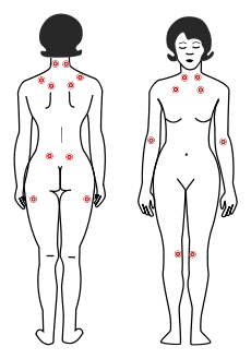 Symptomen varierar, men lika för alla är smärtan. Smärta i muskulatur och leder, som oftast flyttar på sig och varierar i styrka. Som en direkt konsekvens av smärta och anspändhet 24/7 kan man få vissa utmattnings-symptom som dålig minne, dålig konsentration, sömnbrist och dålig kvalitet på den sömn man får samt utmattning, störningar i synen, ändrad kroppstemperatur, avdomningar och känslolöshet i kroppsdelar pga spända muskler, överkänslighet för stöt och tryck. Man kan få besvär med magen och matsmältning, andning och hjärtrytmen.