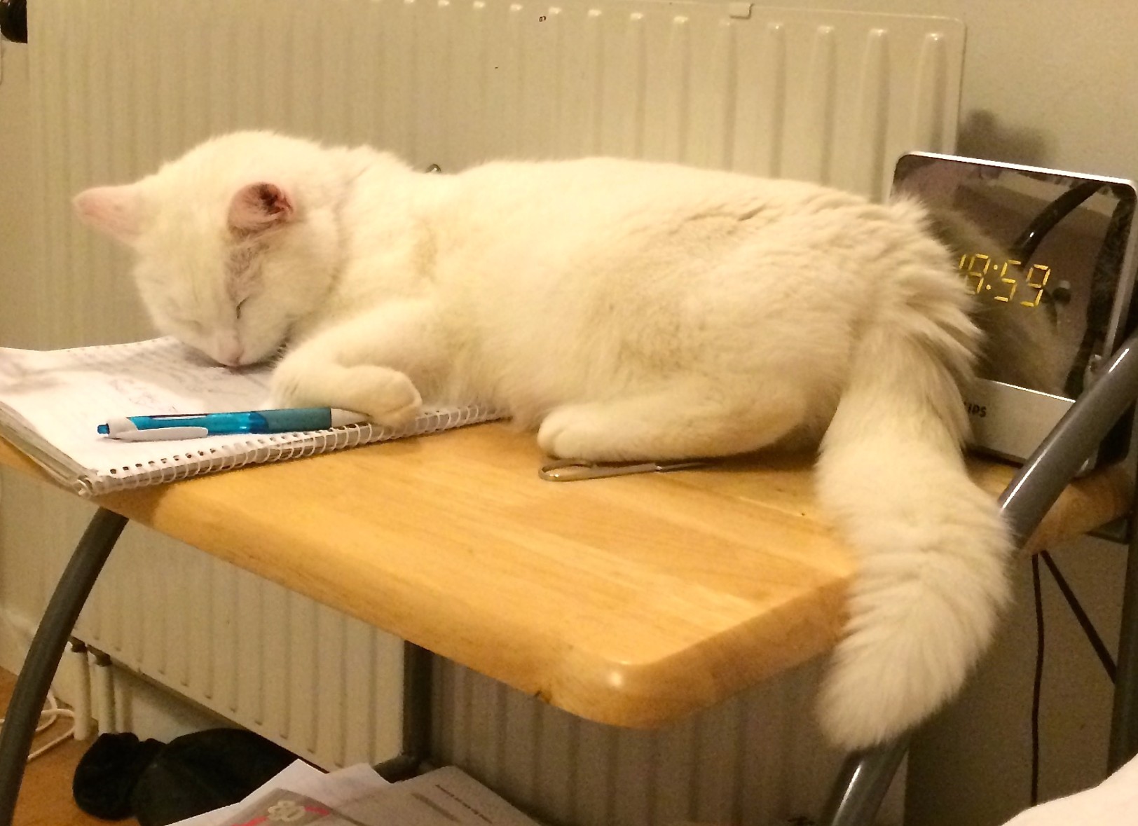 Här är en bild på min sötis som ligger och sover på mitt nattduksbord. Cutiepie!
