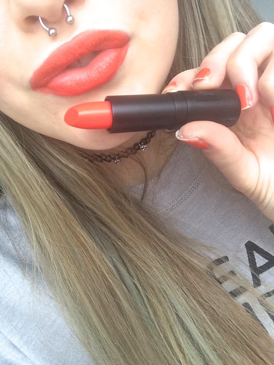 Detta är alltså ”dare” från make up store. Riktigt fint måste jag säga! Inte sådär jätte rött eller orange. Utan lite mer röd-persika. Detta kan man ju ha till fest men även till vardags om man vill. Det är ju absolut inte för mycket! (haha, kommer från mig som har på mig typ vad som helst). Så jag tycker att det är perfekt 😀 Färgen sitter även på i stort sätt hela dagen, super. Man bör dock bättra på det åtminstone 1 eller 2 gånger per dag. Men det sölar inte och är kladdigt, utan det sitter fint på läpparna 🙂 kostar 170kr!