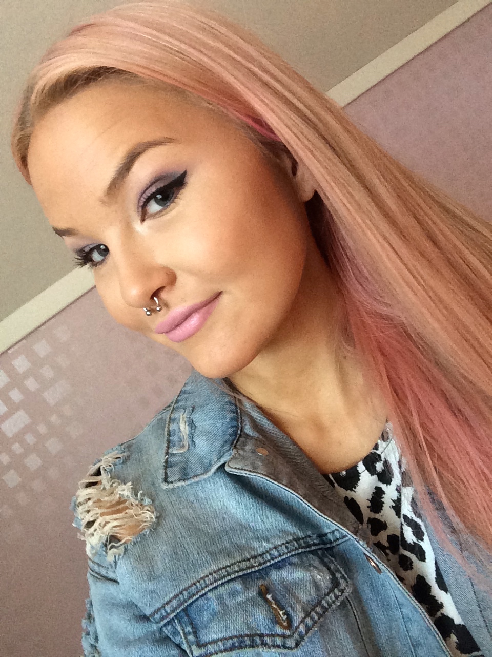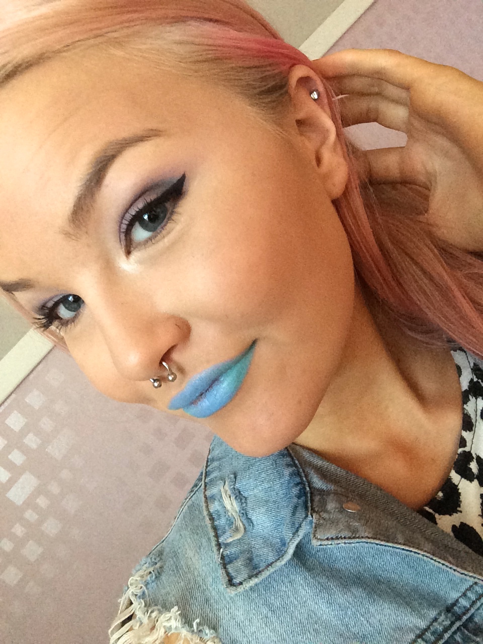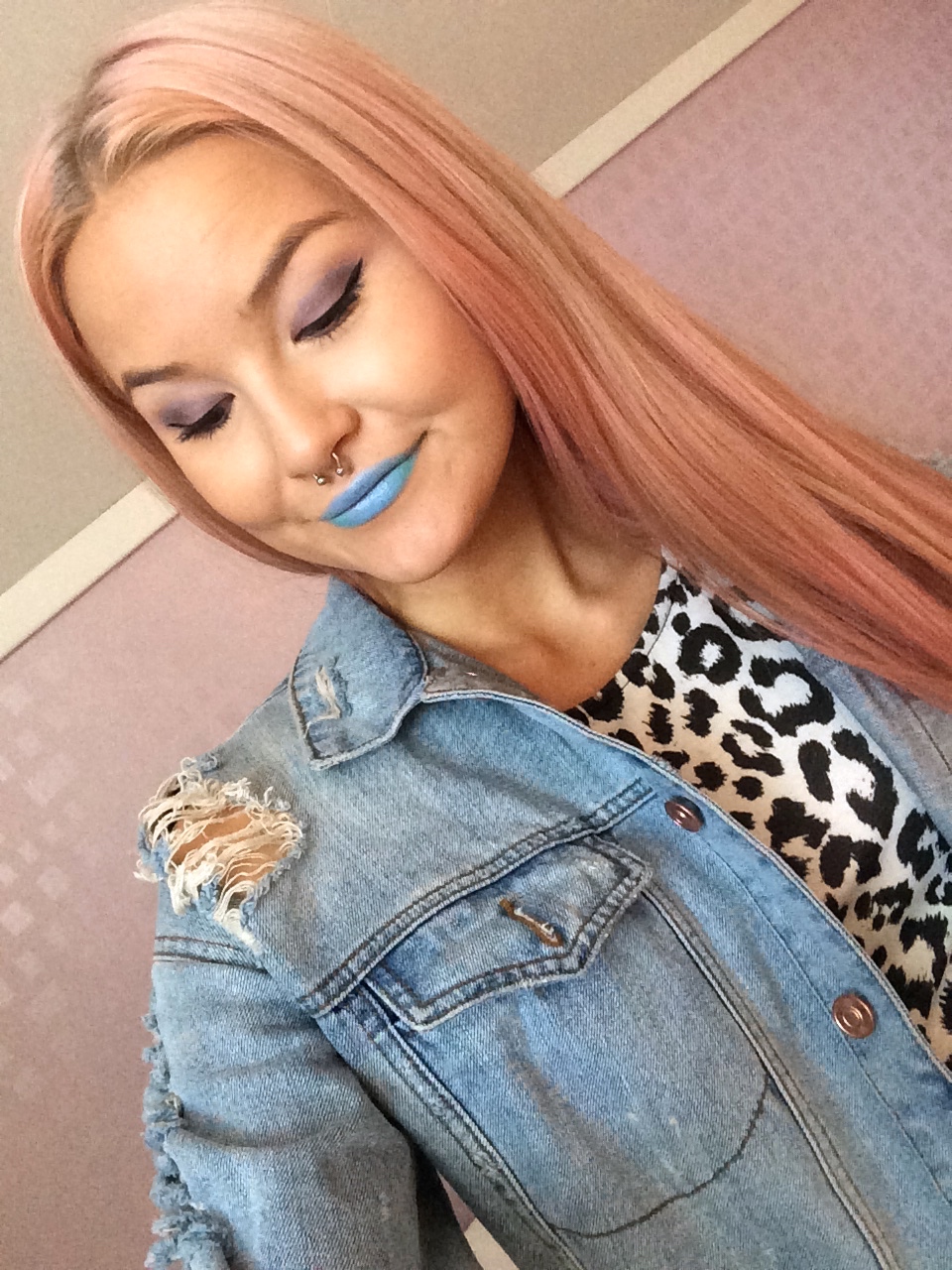 Jag började med att ta på mig det blåa läppstiftet, men jag tyckte faktiskt att det blev lite för mycket.. Eller ah, det tog upp all uppmärksamhet från ögonen vilket störde mig lite. Så jag bytte till ljusrosa läppar istället! Vad tycker ni blev bäst, jag tror jag gillade rosa läppar till just denna looken. Haha fast det är kanske för att jag la ner en tid på att få till skuggan 😉