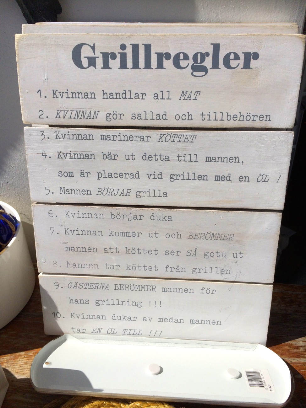 En sak jag tänkte dela med mig av i detta inlägg, som gjorde mig fruktansvärt störd idag var när vi kom in i en sän där vanlig ”smögenaffär” med massa smått och gått, inredning osv. Där var det första jag såg en liten tavla för ”grillregler”. Ville typ spy på den, de i affären. Haha, helt seriöst. Så damn sexistiskt. Kom igen lixom, det är 2015- hur het är inte denna frågan? Vem tillåter den att säljas egentligen? Man blir ju lack.
