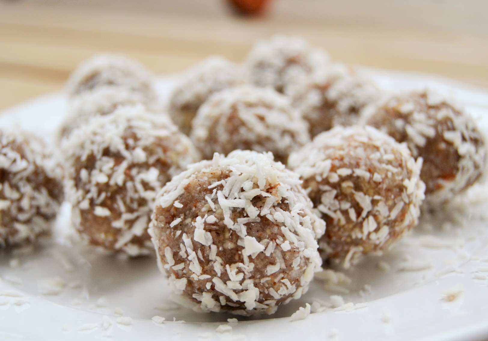 Mixa alla ingredienser till en smet, det kan behövas tilläggas lite vatten om smeten fortfarande är smulig. Rulla till runda bollar och rulla i kokos. Ställ in i kylen. Mums!