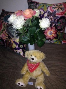 Dag 2. Adam ligger fortfarande på plus efter att ha skickat dagens ros-bild! Sedan är det lite oklart varför vasen står i sängen och att det är en nalle som vaktar blommorna. Men jag antar att det är för att ingen ska stjäla dem!