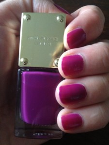 När vi fick hem våra press-kit från Michael Kors fick vi tyvärr inte med någon prislista. Lacket har likt Chanel och Dior ett löst lock, i detta fall guldigt, med en vanlig skruvkork under. Penseln är ganska smal men lättapplicerad. Jag brukar INTE gilla lila men har äntligen fallit för en lila nyans – nämligen Michael Kors Envy. Lacket behöver definitivt två appliceringar (täcker inte med ett laget) men resultatet blir en jättefin, jämn yta med glansig finish! På denna bild är lacket på dag nummer två så hållbarheten är också bra! Gillar ni nyansen?