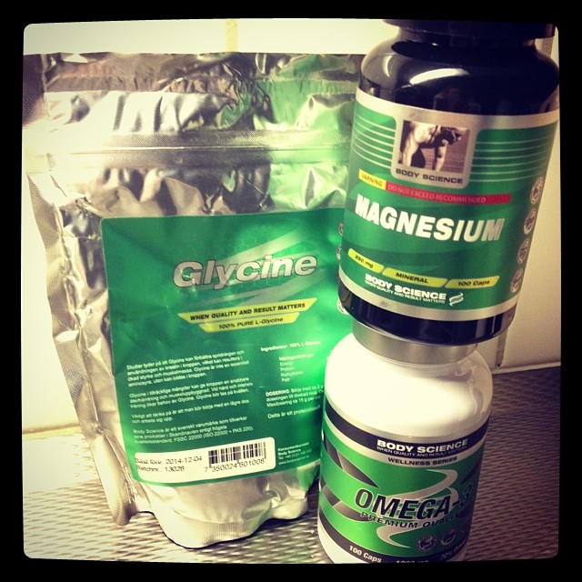 Sorry för dålig uppdatering. Har haft en svacka men är nu definitivt på banan igen. Jag tror att det blev en del missförstånd igår när jag statusuppdaterade ”Jag ska mäta upp 10 g pulver men har ingen våg – hur många ml är det?” på FB. Jag borde kanske ha tagit med bilden nedan. Morgan köper alla sina tillskott på MM Sports och tipsade mig om deras prisvärda Omega– tabletter. Fick även höra att en blandning av Glycine (10 g) och Magnesium (4 tabletter) skulle ge bättre sömn så jag testade det igår. Naturpreparat i det syftet har aldrig fungerat på mig tidigare, så jag var skeptisk men kände mig faktiskt sömnig av denna kombination. Dock gick känslan över relativt snabbt så jag rekommenderar att man tar det precis innan man ska lägga sig. Inte en timme innan som jag gjorde.