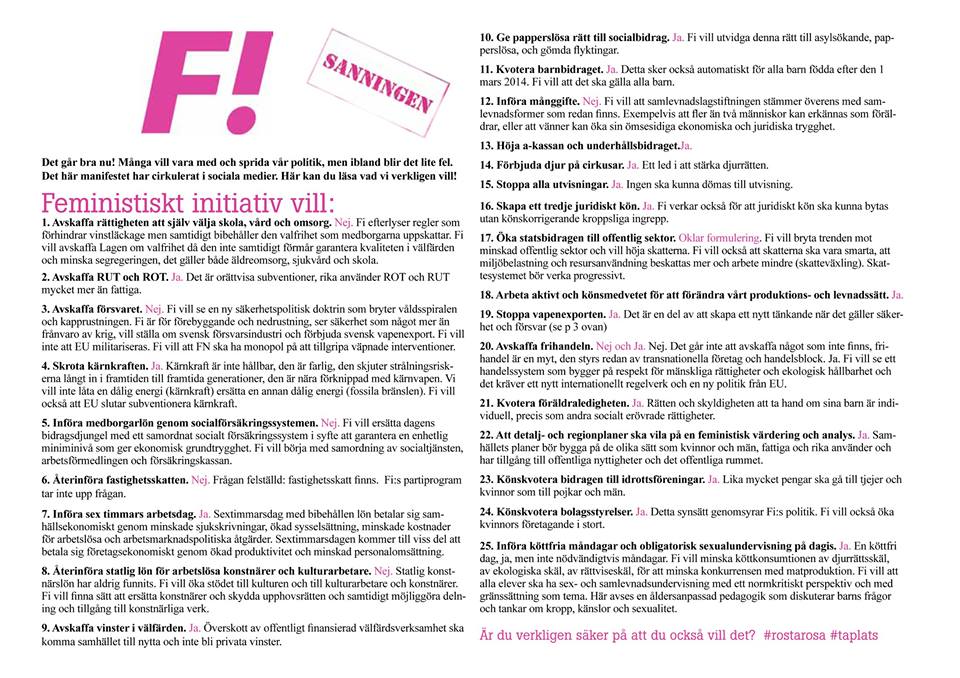 I helgens tävling lade jag upp en bild på 25 utvalda punkter hämtade från F!:s politiska program. Det borde ha framgått i min text att punkterna är tagna ur deras partiprogram. Det är  alltså inte F! själva som har satt ihop bilden. Nu har F! satt ihop bilden nedan eftersom de menar att 5 av dessa 25 punkterna inte stämmer. Då vill jag självklart även publicera detta material så ni ser att jag inte undanhåller fakta från mina läsare. Som ni kan se stämmer de flesta punkterna ni har kommenterat även enligt deras egen utsago (6 timmars arbetsdag, stoppa alla utvisningar, sexualundervisning på dagis, skrota kränkraft m.m.).  Sedan är deras bortförklaringar av de andra 5  punkterna det mest paradoxala jag någonsin har läst.  Läs punkt 1: ”Nej. Vi vill inte avskaffa rättigheten att själva välja skola, vård och omsorg. Vi vill avskaffa Lagen om valfrihet.” Eller punkt 12: Nej, vi vill inte införa månggifte. Vi vill ”införa en gemensam samlevnadsbalk där två eller flera kan ingå”. Detta gör polygami lagligt.  Punkt nr 3. Nej vi vill inte avskaffa försvaret. Vi är bara för nedrustning.