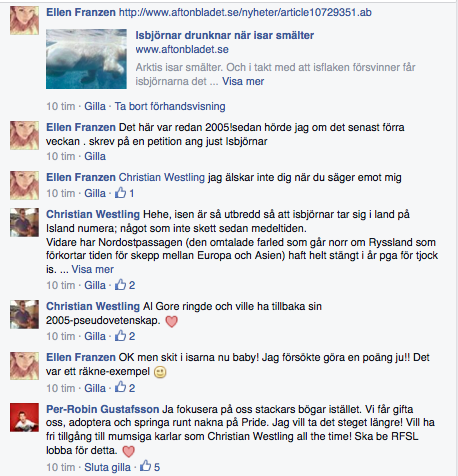 Jag tror att min FB-wall kan vara ganska underhållande bitvis. Den följer vissa tydliga mönster. Den börjar med att jag inte kan sova och istället för att tänka harmoniska tankar kommer på något som stör mig, vilket föranleder en ”skriva av mig”-status. Sedan svarar Sara, som också har insomnia, och så hakar CW på och till slut handlar konversationen om honom! Denna självgoda, skäggiga man ha ha!