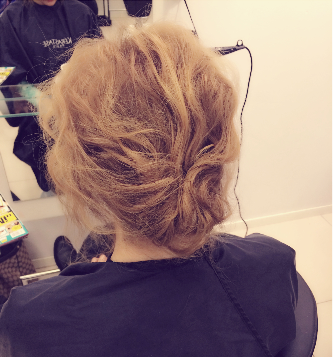 Du börjar med att göra en volymföning och toupera håret i hårbotten. Sedan tar du en mini-plattång och gör små vågor. Som avslutning fäster du bara in topparna med pins. Då kan ingen gissa att du har ett tunt hår som bara når till axlarna. Ha en underbar onsdagskväll!