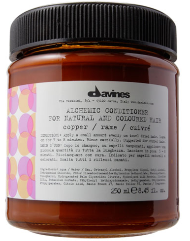 davFör att bevara min fina nyans av strawberry blonde använder jag numera Davines Alchemic Conditioner Copper (279 SEK) – ett färgförstärkande balsam särskilt för kopparfärgat hår. Formulan innehåller destillerade, rena färgpigment som förstärker och bevarar koppartoner samt hydroliserat mjölkprotein som vårdar håret och motverkar kluvna hårtoppar. Konsistensen påminner om en lättviktig inpackning och ger en fin, svag och jämn nyansering. Används med fördel ihop med färgschampot Alchemic Shampoo Copper (229 SEK) som har en tunn, lättlöddrad konsistens. Milda tensider rengör håret skonsamt men effektivt samtidigt som olivolja peg-7 ester återställer fuktbalansen. Kombinationen av dessa två ger en superfin lyster och glans. Dessutom gillar jag förpackningarna!