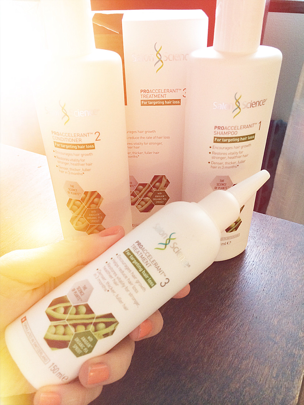Kontinuerlig användning av PROACCELERANT -regimen bidrar till ett tätare, tjockare, fylligare hår på 3 månader. Det utlovar nya hårvårdsmärket SALON SCIENCE en hårvårdslinje baserad på ny forskning omstamceller från växtriket. Sortimentet är indelat efter fyra hårvårdsproblem, varav ett är håravfall – Anagain Proaccelerant-serien. Salon Science Anagain Proaccelerant Shampoo (235 SEK) beskrivs som en mild rengöring packad med AnaGain – ett organiskt ärtgroddsextrakt som är rik på reparativa proteiner, stärkelse och fibrer. I kombination med koffein stimuleras blodcirkulationen att bidrar till förlänga livscykeln för hårroten samt främja tillväxten. Formulan är genomskinlig, väldigt lättlöddrad och har en mild, fräsch doft. Rekommenderas att användas ihop med Salon Science Anagain Proaccelerant Conditioner (285 SEK) samt den mest verksamma delen i serien – Anagain Proaccelerant Treatment (585 SEK), som är en intensiv hårbottenbehandling. Formulan är ett genomskinligt, väldoftande serum som ska appliceras i hårbotten två gånger om dagen. Serumet ska sedan masseras in noggrant – vilket i sig ökar mikrocirkulationen. Jag tror att detta kan vara något riktigt bra, det enda problemet är att den blöta syns på håret några timmar efteråt. Detta gör att jag bara använder min på kvällen, så den hinner torka in helt över natten.
