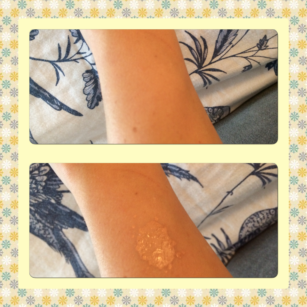 Resultat: På armen gav denna lätta formula en sidenmatt, fin finish (när jag hade smörjt ut den – se bild nedan). I ansiktet där jag är lite torr blev det ett tyvärr torrt och något ojämnt resultat. Det står att den ska passa alla hudtyper men min åsikt är den är perfekt för lite fetare hy! Alt. normal hy om man vill ha en pudrig finish. Tyvärr var de utlovade ”fuktgivande kristallerna” missing in action på mig. Täckningen är svag efter en applicering men kan bättras på något. Ett plus för fina ljusreflekterande pigment. Jag testade nyansen Light som passade mig, och anatagligen de flesta med ljus skandinavisk hud.