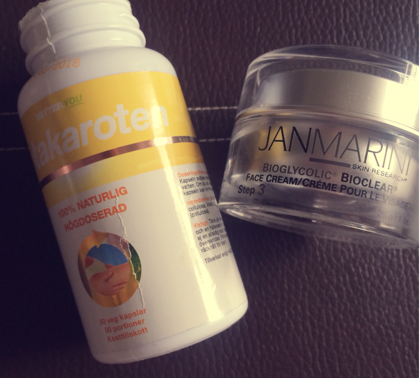 Som ni vet testar jag MYCKET produkter och i ärlighetens namn håller de flesta inte vad de utlovar. Nu ska jag dock tipsa om två produkter som gör det! Har testat ett 20-tal Betakaroten-tabletter och 2-3 av dem har fungerat – i det avseende att de har gett en effekt på hudtonen. Den som har funkat bäst på mig är BETTER YOU Betakaroten som faktiskt ger en svag nyans av solbränna trots skitvärdet Sverige har bjudit på denna sommaren. JAN MARINI Bioglycolic Bioclear Cream (649 SEK) är något så ovanligt som en creme som förminskar stora porer. Givetvis är det syror som är hemligheten, formulankombinerar glykolsyra med salicylsyra och Azelaic syra så det kan hända att du flagar något ( har en exfolierande/peelande effekt) om du har känslig hy. Jag blir bara fräscht rosig om kinderna (applicerar den enbart i T-zonen) och porerna blir synbart sammandragna. Ska även vara perfekt för vuxen-acne och pigmentförändringar!