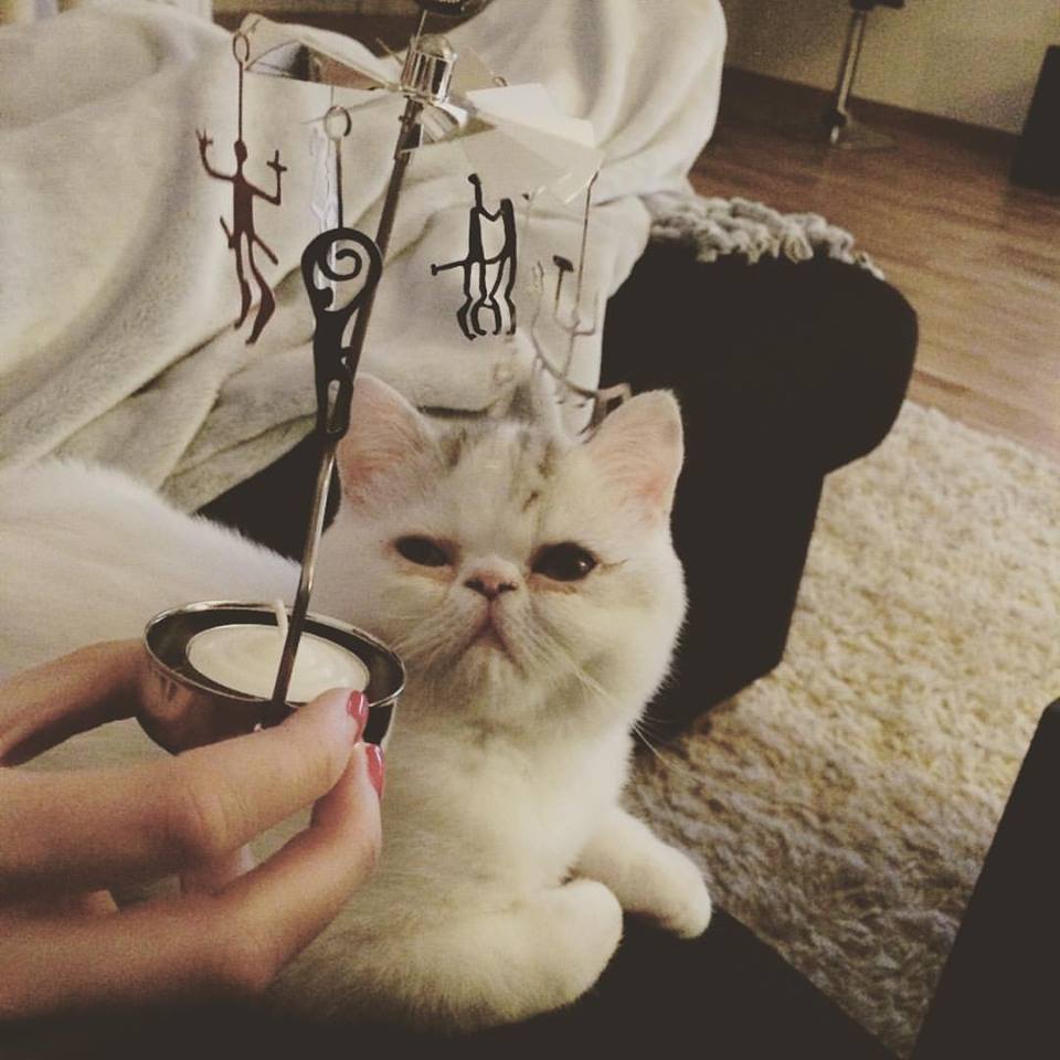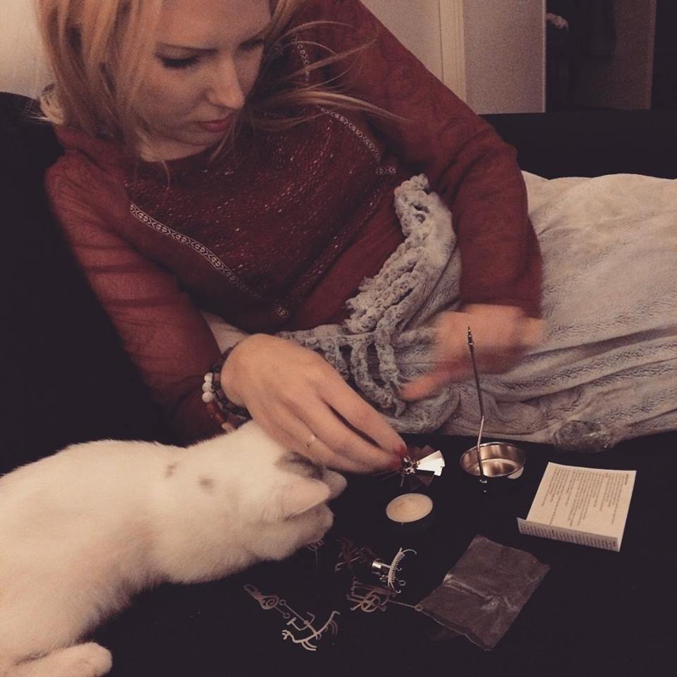 LYX att få ha en av sina bästa kompisar från Sthlm på besök i Växjö! Anja kom sent igår kväll, men vi hann med ett besök på Izakaya (Växjö:s EAST) och en tjejfilm innan vi somnade med varsin bok och en helvild kattunge i dubbelsängen. Jag väckte Anja med nybakat bröd, thé, ägg m.m då jag vet att hon är en riktig frukostmänniska! Sedan har vi gått skogspromenad (jag bor ju i skogen), jobbat lite och sedan lagat halloumi-sallad till lunch. Tredje gästen var min kompis R som sitter för KD i samma nämnd som mig. Gladast av alla var kissen som fick så mycket uppmärksamhet av kattälskaren Anja samt en present: en hemstickad boll, han blev helt galen i! His own. His precious! (bild nederst) F.ö. fick jag en jättefin inflyttningspresent: en GIVENCHY-parfym jag älskade samt ett änglaspel med nordisk tema. Som ni kan se nedan hjälpte kissen till att sätta ihop änglaspelet och tittade sedan beundrande på de silverglänsande figurerna!