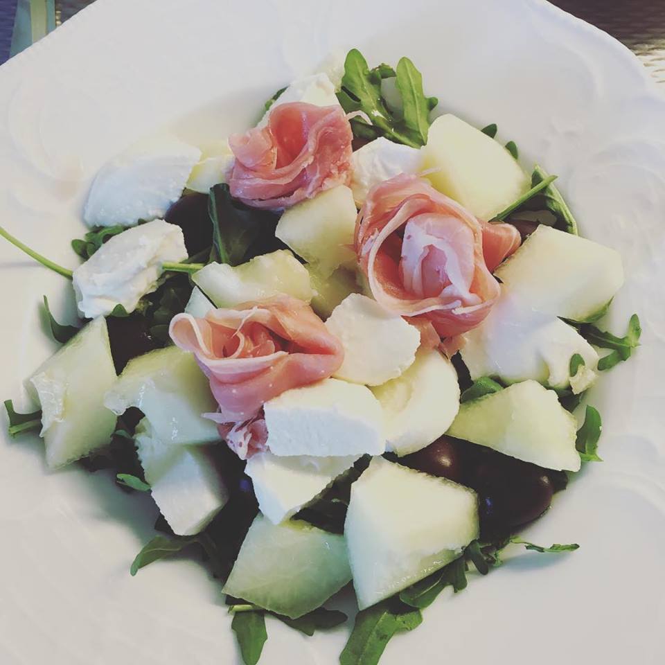 Lunch: Melon & Ruccola salad With mozzarella and prosciutto-roses