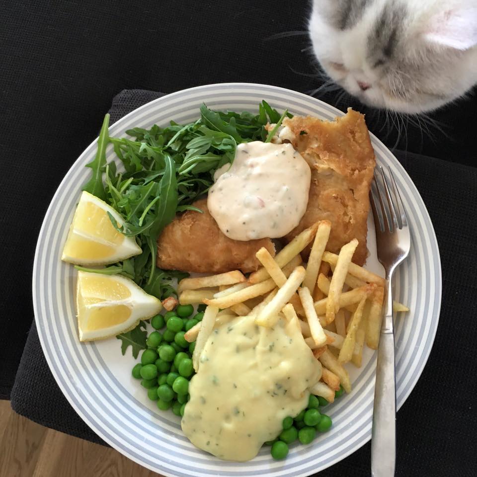 Idag blev det lunch av det lite nyttigare slaget. Jag äter dock mycket friterad fisk, som jag vet inte är det nyttigaste. Särskilt inte när jag kombinerar den med bearnaissås och hemmagjord dressing (majonäs, bostongurka, chilisås och peppar). Lucius kände fiskdoften direkt som ni ser nedan haha! Hur det går med viktnedgången? Inte alls just nu. Och mår riktigt dåligt över det – men har så dålig karaktär! Nu när våren kommer rör man ju mycket mer på sig naturligt åtminstone. Kram!