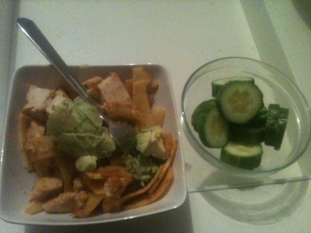 Detta är förmodligen universums tråkigaste dagens middagsbild. Men såhär ser det ut ibland när man bara ser en måltid som ett energiintag utan någon som helst njutning:) Jag brukar aldrig vara sugen på frestelser på tisdagar men just idag är jag det. Skulle vara gott med lite bröd tillexempel. Tur att man inte är kräsen. Denna kyckling i kokosfett och bambuskott smakar faktiskt gott. Som en pasta nudel/kokos wok;) Och så lite sallad på det, detta blir ju tipptopp. Energi ut energi in:)