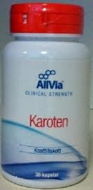 Jag äter även Karoten från Allvia. Karoten är en naturlig kombination av klorofyll, betakaroten och övriga karotenoider som finns i dunaliellaalger. Blandningen inkluderar betakaroten, alfakaroten, lutein, kryptoxantin och zeaxantin. Detta ger ett omfattande antioxidanttillskott. Karotenerna ger kroppen möjlighet att tillverka vitamin A i den mängd som behövs.