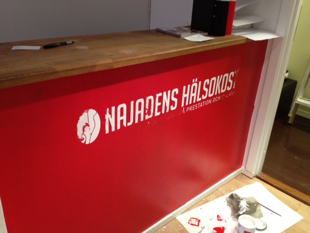 Vi försökte få upp loggan i torsdags men hade låtit färgen torka för länge så en del av texten föll bort. Så då var det bara att ta bort allt, måla om grunden. GÖRA OM OCH GÖRA RÄTT. Känns som om det går emot oss lite just nu. Antingen drar det ut på tiden, eller så blir något fel eller så är det ett missförstånd. Men allt kommer ju bli bra till slut så försöker inte att lägga allt för mkt fokus på problemen;)