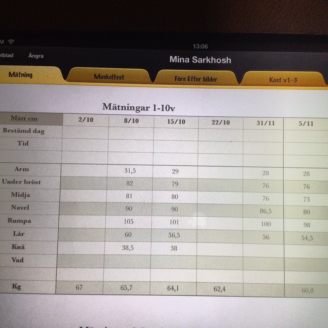 Här kommer mått på en utav mina 10v klienter. Med träningen kämpar hon på med med kosten har hon haft det svårt och jobbigt. Hon fuskar gärna så resultaten är inte ens där de skulle kunna vara. MEN jag är riktigt stolt över henne. Här är måtten de första 5veckorna: