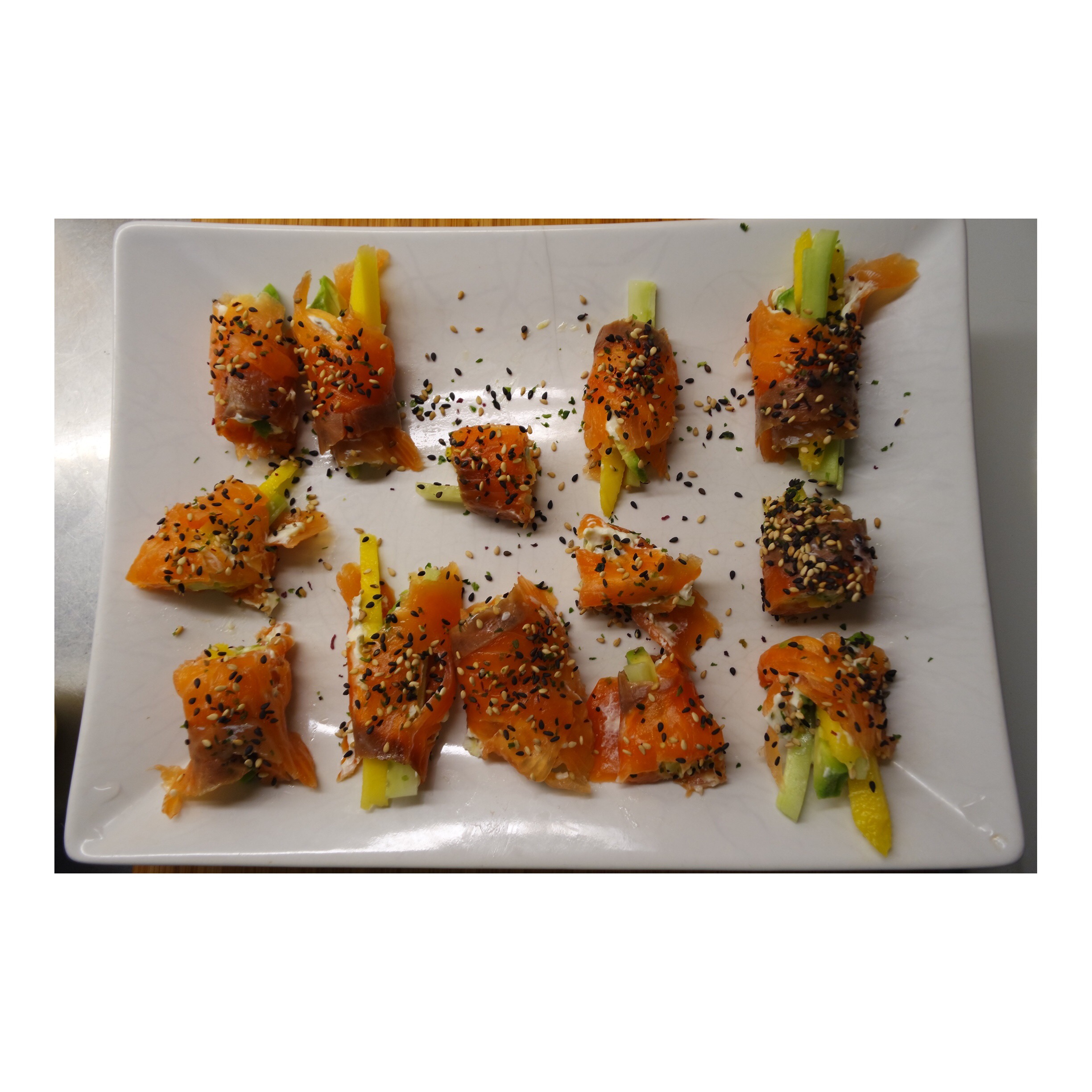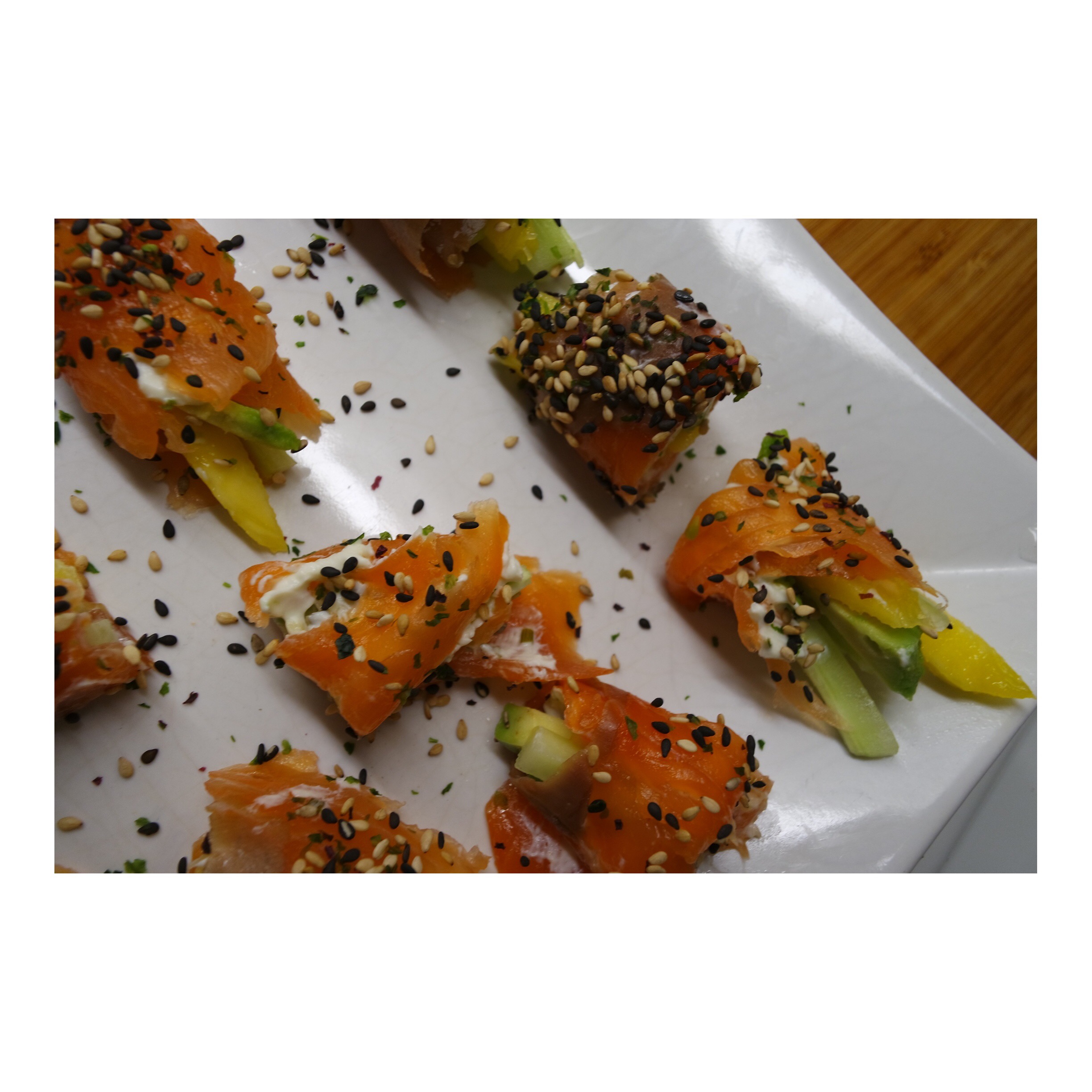 Lax-rullar 3 maj, 2015 av emeliepisano kallrökt lax, gurka,mango,avokado, gräslök,Philadelphia. Rullat i sesamfrön 🙂